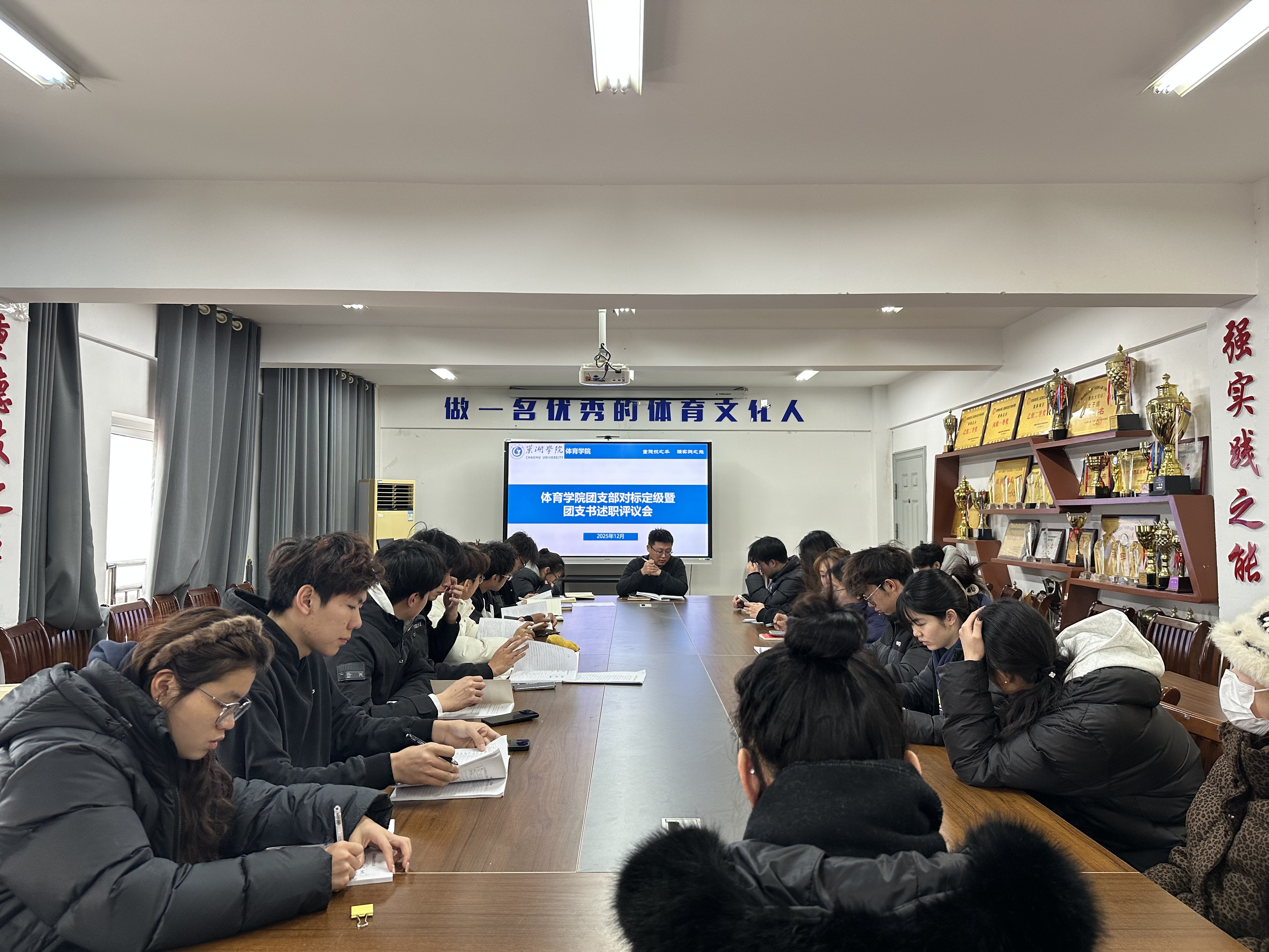 为扎实推进团支部建设标准化、规范化,切实提升基层团组织凝聚力与战斗力,2025年12月26日中午,体育学院团委在学院会议室召开团支部对标定级暨团支书述职评议会,各班级团支书及学院团委同学参会,会议由体育学院团委负责人田中正主持。