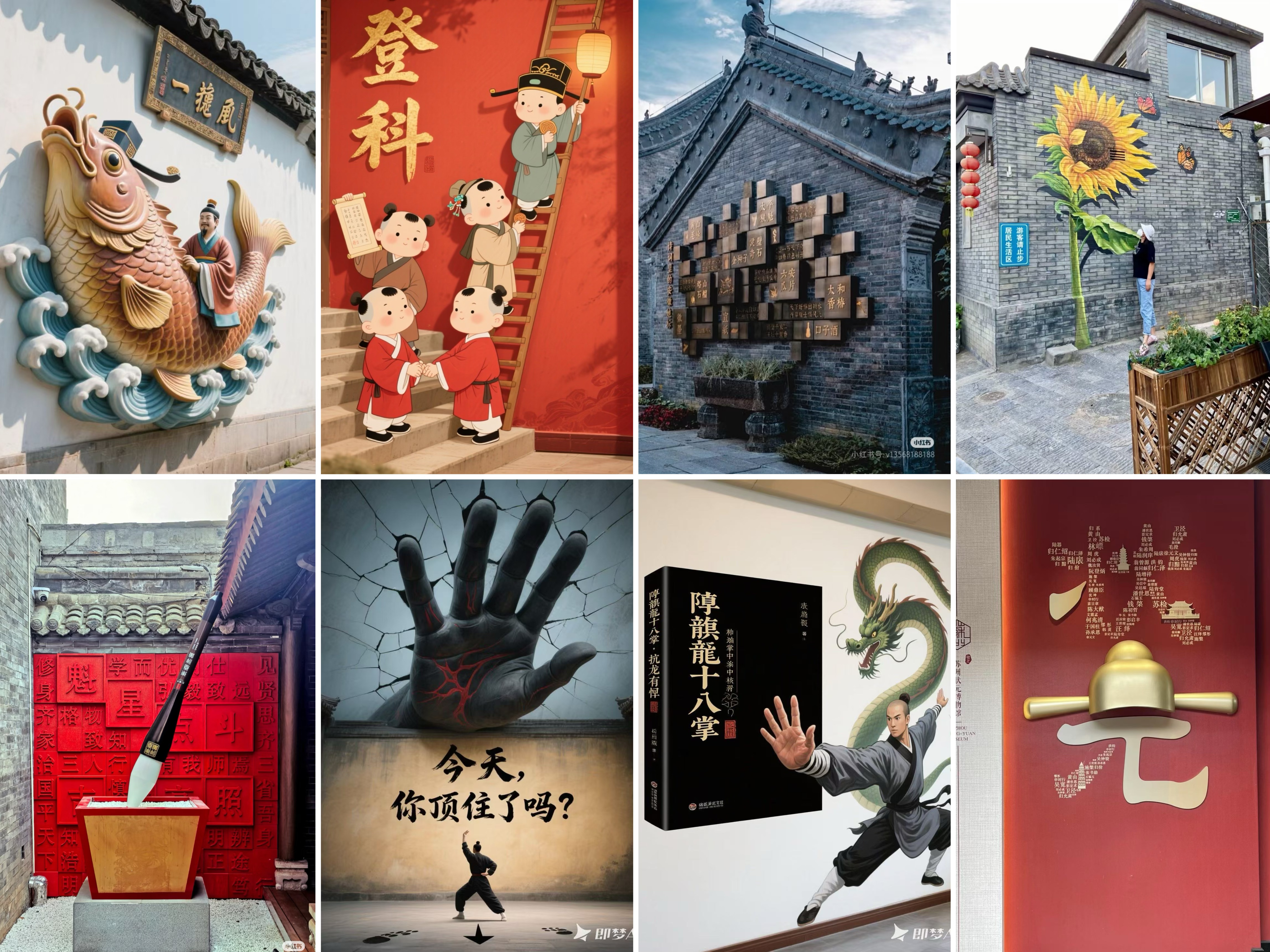 花冯村方案以江湖文化为核心创意,通过巨幅立体书本造型墙打造视觉焦点,红底鎏金侠字结合水墨背景形成网红打卡点。设计融入立书而舞倚墙而剑等互动场景,将武侠精神与乡土景观有机融合,营造沉浸式文化体验空间。严二村则聚焦田园书香主题,巧妙融合科举文化与现代设计语言。以勇攀鳌岭 志立严二为精神内核,依托鳌鱼岭地形特色,打造集生态宜居、乡村旅游、励志教育于一体的特色文化村落。