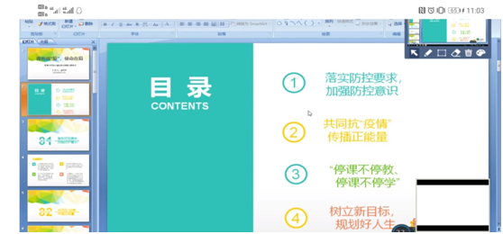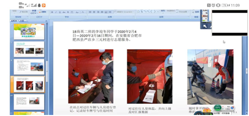本次主题班会围绕四点展开,第一,落实防控要求,加强防护意识;第二,共同抗“疫情”,传播正能量;第三,停课不停教,停课不停学;第四,树立新目标,规划好人生。