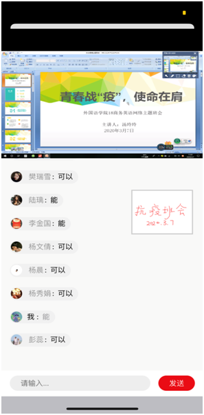 为深入贯彻落实习近平总书记关于新冠肺炎疫情防控工作的一系列重要讲话和重要指示批示精神,把教育部党组、省委省政府、省委教育工委省教育厅和学校各项防控工作要求落到实处,3月7日上午,辅导员汤玲玲利用学习通直播平台开展了抗击疫情线上主题班会,2018级商务英语专业93位学生全部参会,会议由汤玲玲主持。