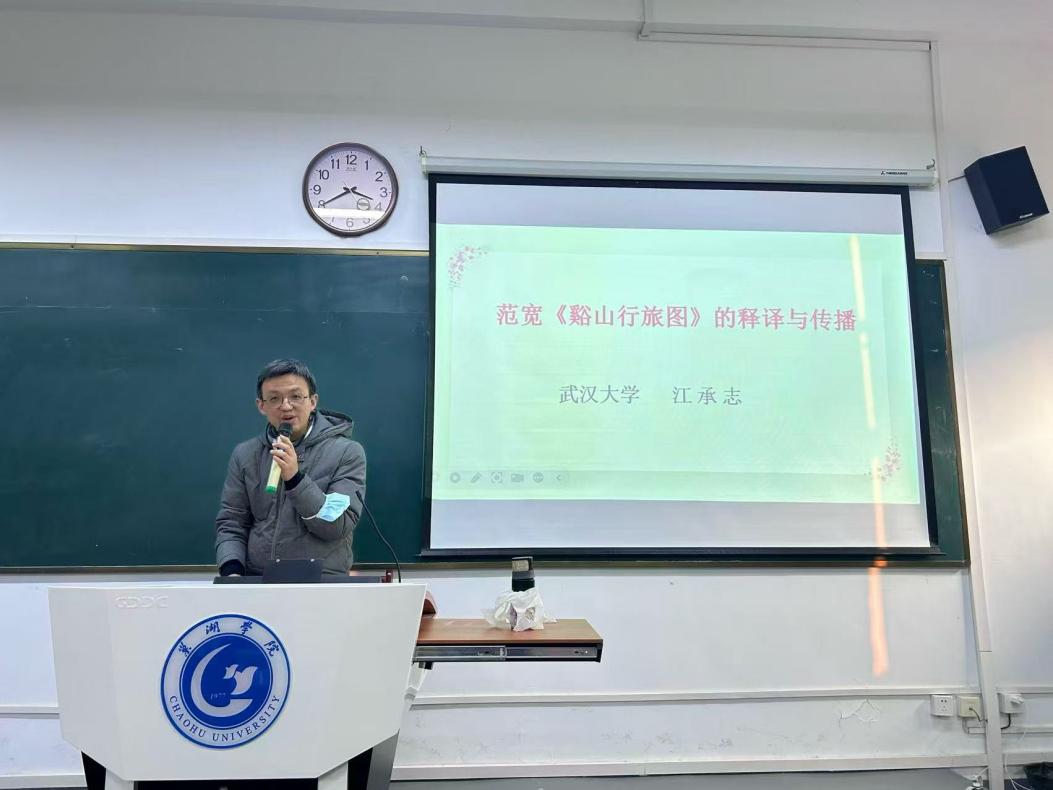 2025年12月17日下午3点40,应科研处和外国语学院邀请,武汉大学外国语言文学学院副院长、博士生导师江承志教授在明德楼西二大教室作了一场题为《范宽<谿山行旅图>的释译与传播》的学术报告。外国语学院全体教师参加了本次讲座,讲座由副院长慕媛媛主持。