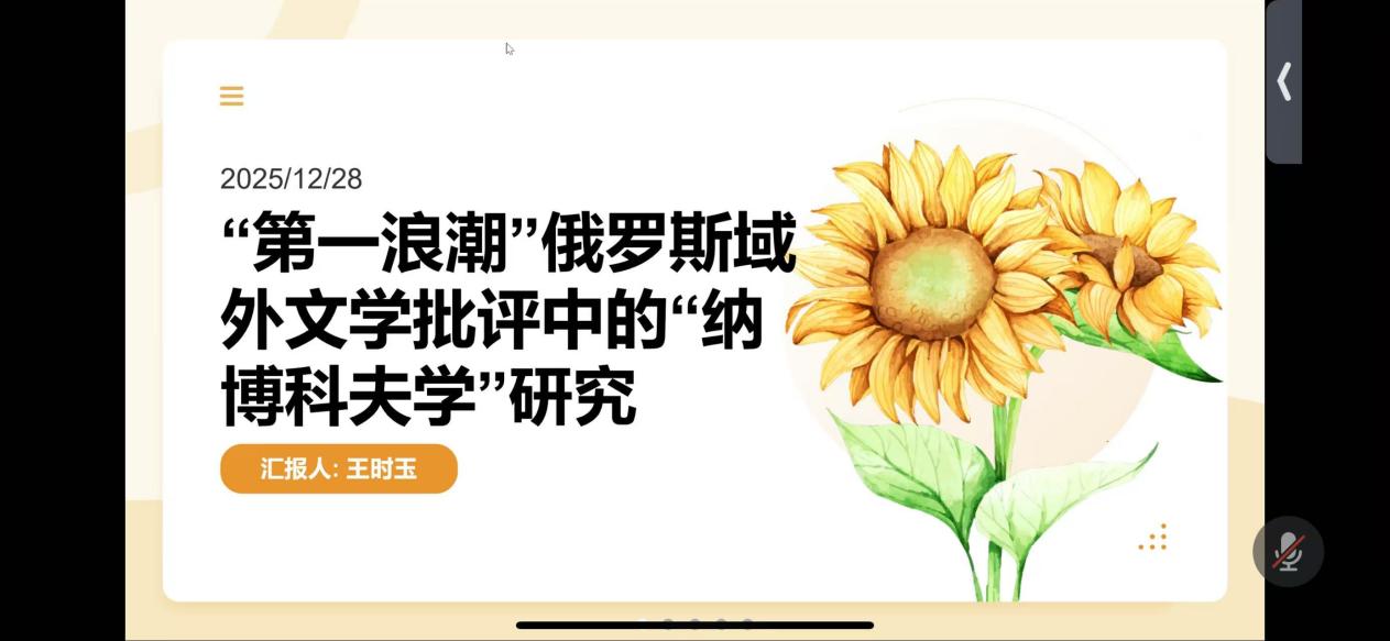 2025年12月28日晚7点,外国语学院王时玉博士在腾讯会议线上作了题为“‘第一浪潮’俄侨文学批评中的‘纳博科夫学’研究”的学术讲座。讲座由副院长慕媛媛主持,外国语学院全体教师线上参会。