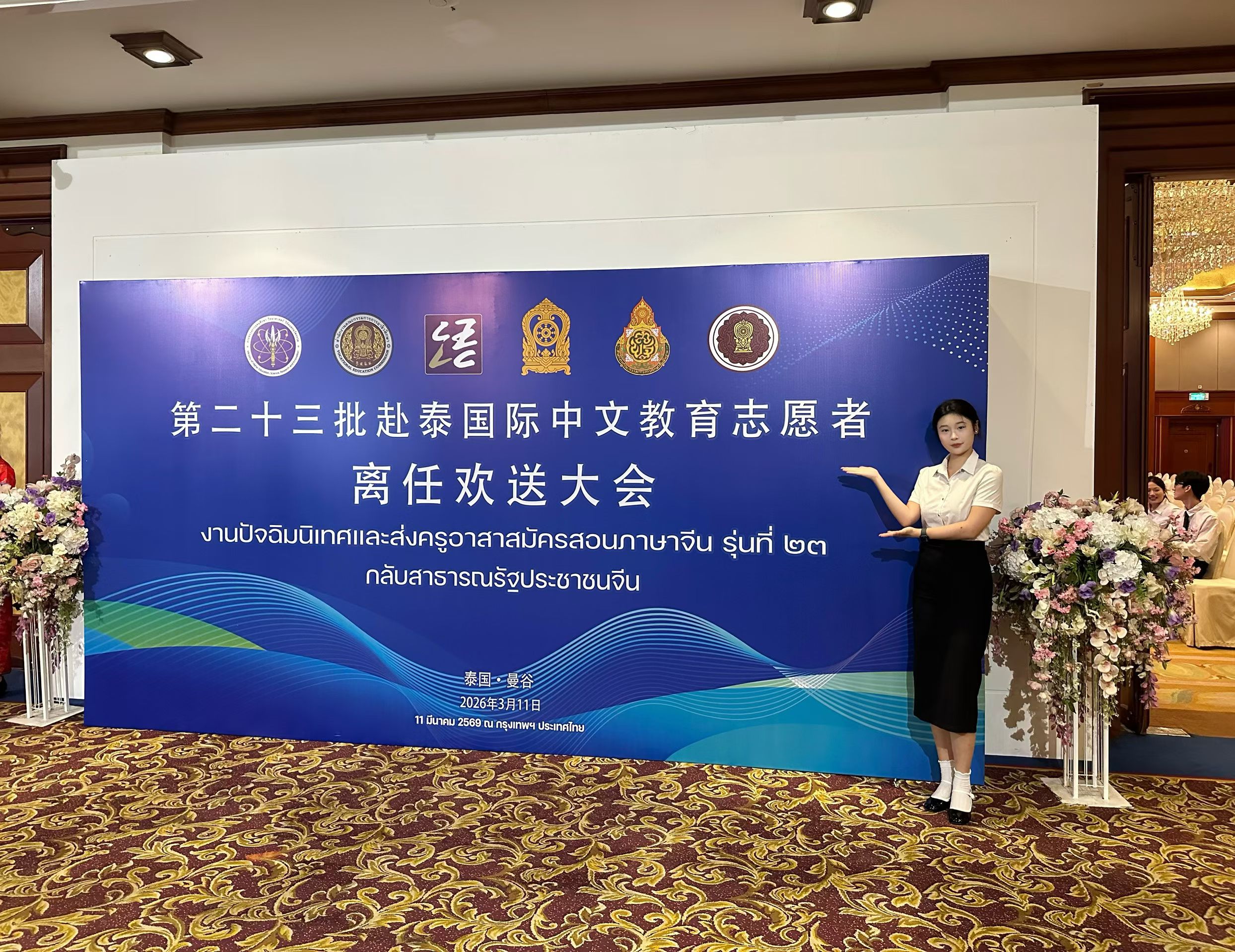 近日,在泰国曼谷举行的第二十三批赴泰国际中文教育志愿者离任欢送大会上,beat365中国官方网站外国语学院优秀校友徐嘉慧圆满完成了为期一年的国际中文教育志愿服务,带着中泰两国师生的祝福与牵挂,即将踏上归程。从母校的菁菁校园到泰国的三尺讲台,她用青春与热爱,将中文的种子播撒在异国他乡,让文化的纽带越系越紧。
