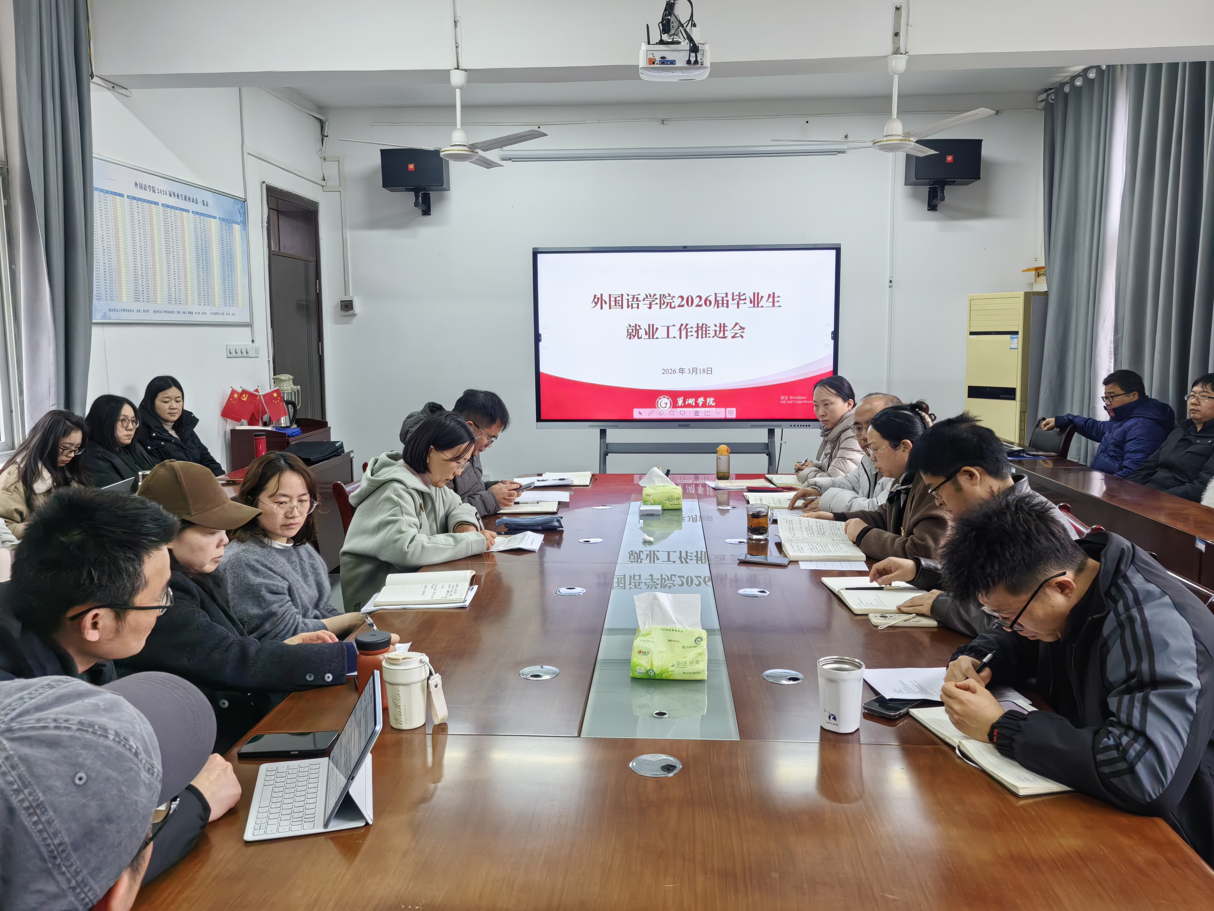 为进一步推进2026届毕业生就业工作,3月18日下午,外国语学院召开2026届毕业生就业工作推进会议。外国语学院党政班子成员、各系部主任、学生党支部书记、2026届毕业班辅导员以及全体2026届毕业生就业帮扶指导老师参加会议。会议由学院党委书记张蕊主持。