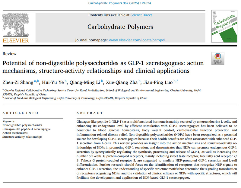 近日,安徽省环巢湖乡村振兴协同技术服务中心(培育)研究人员尚贞子博士围绕多糖在促胰高血糖素样肽-1(GLP-1)分泌方面发表综述。相关成果以“Potential of non-digestible polysaccharides as GLP-1 secretagogues: action mechanisms, structure-activity relationships and clinical applications”为题发表于国际期刊《Carbohydrate Polymers》(中科院一区,IF:12.5)。