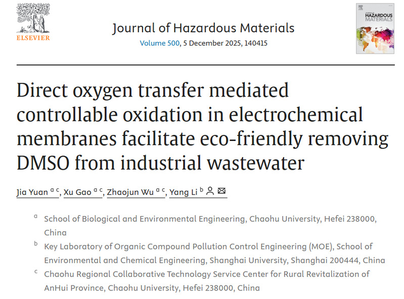 近日,中心研究人员袁甲博士在工业废水深度处理与回用领域研究中取得新进展,相关成果以“Direct oxygen transfer mediated controllable oxidation in electrochemical membranes facilitate eco-friendly removing DMSO from industrial wastewater”为题发表在环境领域权威期刊《Journal of Hazardous Materials》(中科院一区Top期刊,IF:11.3)。