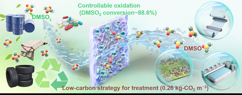 二甲基亚砜(DMSO)作为工业领域广泛使用的有机溶剂,被广泛应用在纺织、电子元器件及橡胶制品生产等领域。传统氧化工艺存在自由基选择性低、碳排放不受控、化学品或能源消耗过量等难题,这些缺陷制约了工艺的可持续性发展,对芬顿氧化和臭氧氧化等传统废水处理工艺提出了新的挑战。本研究提出了一种电催化氯介导的直接氧转移路径,该路径能实现DMSO向毒性更低、可生物降解性更优的二甲基砜(DMSO2)的选择性转化,系统以最低能耗实现污染物高效去除,同步解决了废水处理领域的两大核心挑战:降低二次环境污染负荷与推动低碳净化。这些发现为工业废水可持续管理提供了技术支撑,同时为开发符合全球减碳目标的环境友好型电化学技术指明了路径。
