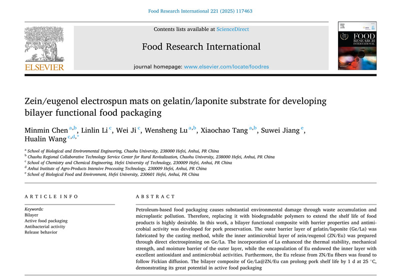 近日,安徽省环巢湖乡村振兴协同技术服务中心(培育)研究人员陈敏敏在食品包装材料研究中取得新进展,相关成果以“Zein/eugenol electrospun mats on gelatin/laponite substrate for developing bilayer functional food packaging”为题发表在国际权威期刊《Food Research International》(中科院一区,IF:8.0)。
