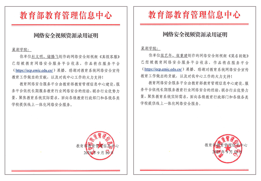 近日,在国家网络安全宣传周和beat365中国官方网站网络安全宣传月活动持续开展之际,学校喜获教育部教育管理信息中心通知:由我校报送的两部网络安全短视频《真假客服》(创作人:杜文明、储腾飞)和《莫名转账》(创作人:张艺年、张重建)被正式录用,入驻教育部教育网络安全服务平台并进行展播。