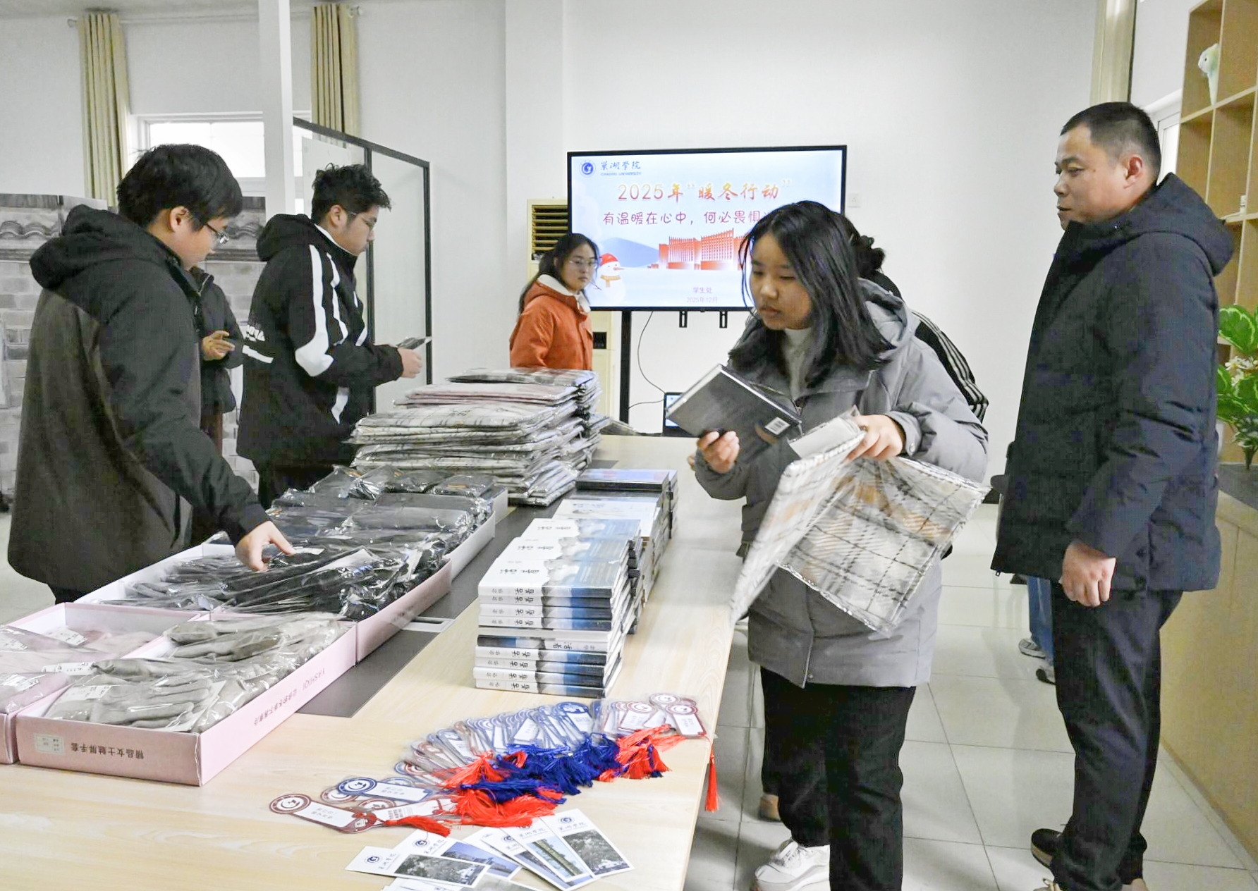 解生困,爱心物资温暖人。学校不仅为80余名家庭经济困难学生精心挑选了围巾、手套等暖冬物资,还现场赠送励志书籍,提供精神暖流。通过实物帮扶和心灵关怀相结合的方式,将浓浓暖意“零距离”“零等待”送至学生身边。泮山苑学生社区现场,同学们脸上都洋溢着暖暖的笑容,纷纷表示“这份温暖不仅是物质上的支持,更是精神上的鼓励。我们要珍惜当下、勤奋学习,以实际行动回报学校、奉献社会。”
