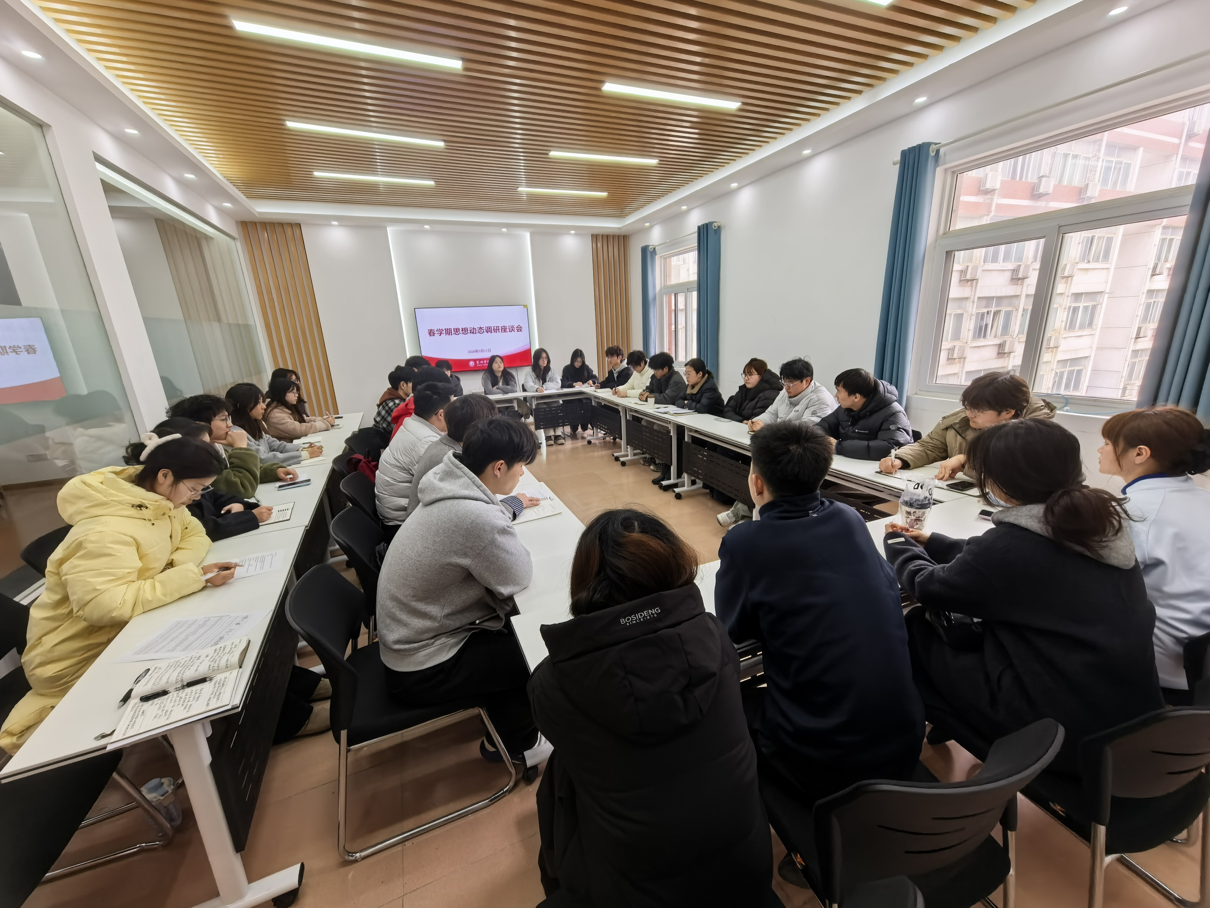 为进一步了解学生的学习生活状况,及时掌握学生思想动态,切实提升学生思想政治教育工作实效,3月11日下午,学校在“智慧域”一站式学生社区召开2026年春学期思想动态调研座谈会,会议由学生处副处长金晶主持,各学院学生代表参加会议。