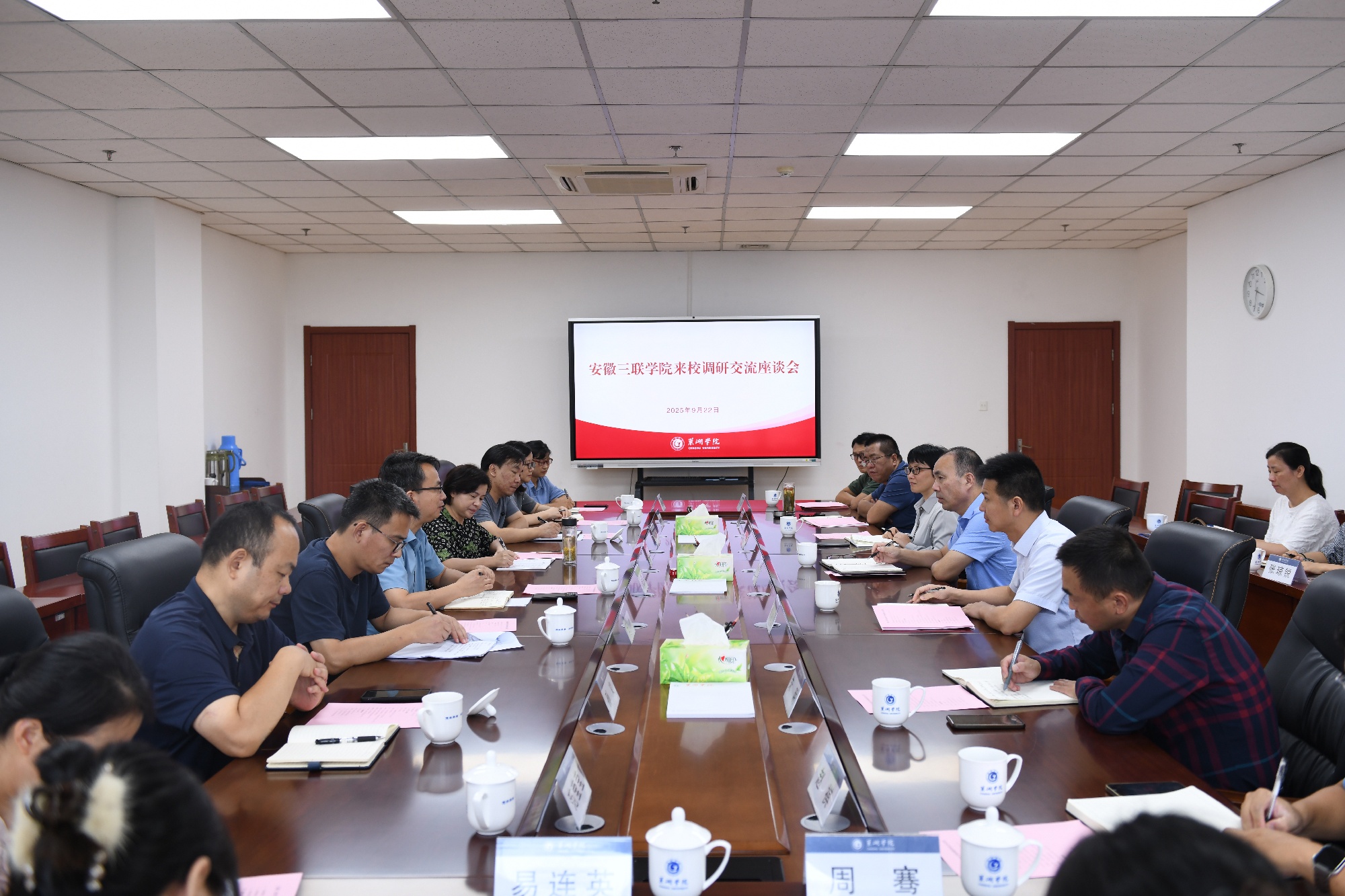9月22日下午,安徽三联学院副校长操晓峰、蔡文芬一行来校调研交流。校党委委员、副校长丁俊苗主持座谈会,发规处、教务处、旅游管理学院、工商管理学院负责人及相关教师参加座谈交流。