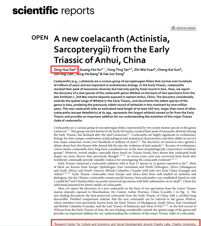 该项研究成果近日发表于施普林格·自然旗下的《科学报告》期刊。环巢湖研究中心研究员戴清华是化石标本的发现者和论文的第一作者,中国科学院古脊椎动物与古人类研究所研究员徐光辉为唯一通讯作者。参与该项研究的单位还包括自然资源部巢湖地层古生物与地质环境野外科学观测研究站、中国地质大学(武汉)、山东省博物院和兴义民族师范学院。该研究受到了国家自然科学基金和科技基础资源调查专项等项目的资助。