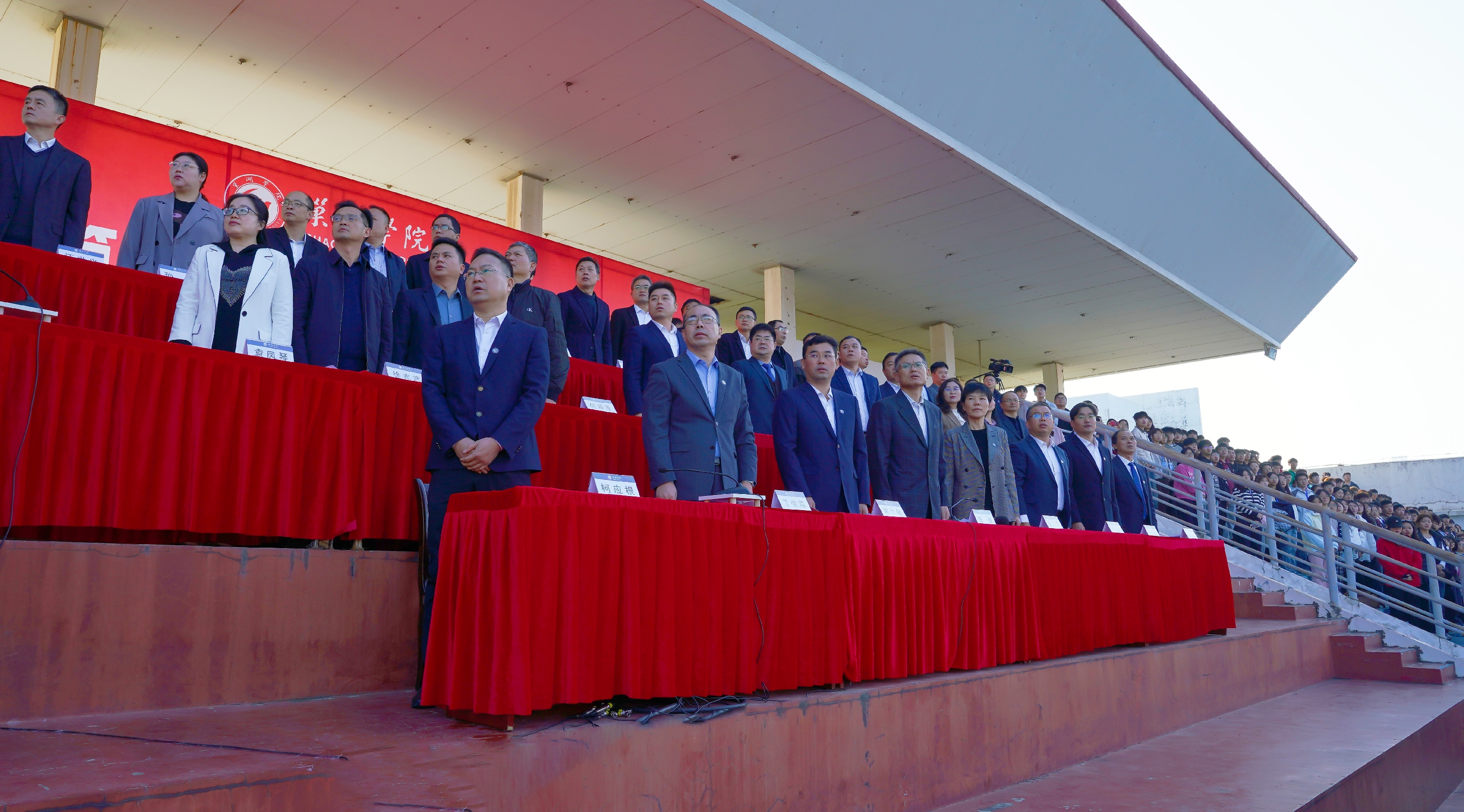 升国旗奏国歌。五星红旗冉冉升起,全场师生向国旗行注目礼,齐声高唱国歌,爱国情怀在运动场上空激荡。