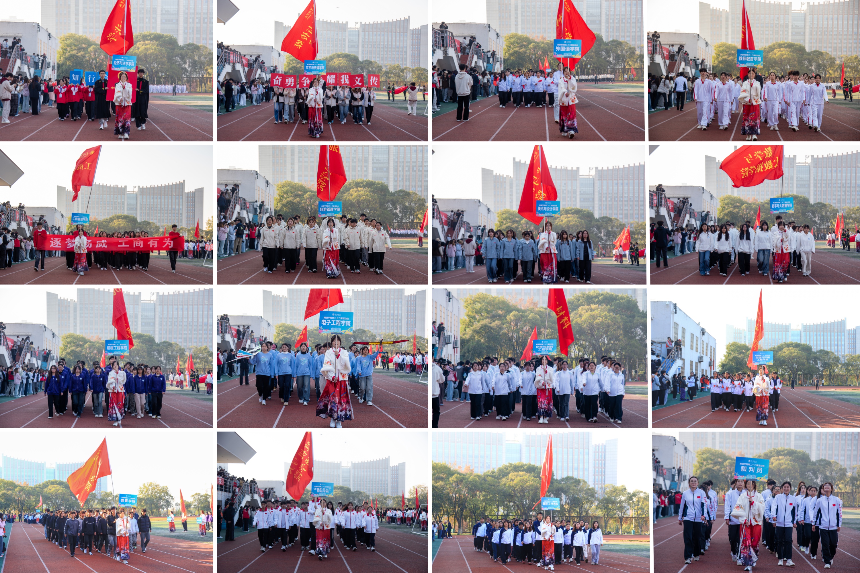 上午8点,开幕式正式开始。国旗和校旗方队高举旗帜引领全场,彩旗方队挥舞五彩旗帜营造热烈氛围,裁判员方队身着统一服装展现公正形象。经济与法学学院、文学与传媒学院、外国语学院、教师教育学院、工商管理学院、旅游管理学院、美术与设计学院、数学与大数据学院、机械工程学院、电子工程学院、计算机与人工智能学院、化学与材料工程学院、生物与环境工程学院、体育学院等14个学院代表队及教职工代表队依次入场,各方队精神抖擞、步伐整齐,充分展现了全校师生积极向上的精神风貌。