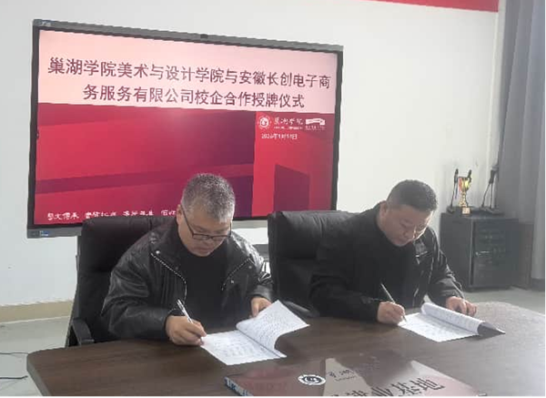 beat365中国官方网站美术与设计学院院长李超峰,副院长田世彬,巢湖市电子商务局负责人周洪波,安徽长创电子商务服务有限公司董事蔡江,视觉传达教研室主任任明明、环境设计教研室主任肖康及设计系骨干教师等出席签约仪式。李超峰在致辞中指出,学院始终坚持“实践育人”的办学理念,此次与安徽长创电商的合作是落实应用型人才培养目标的重要举措,将为学生提供实践平台,助力企业吸纳优质设计人才。蔡江表示,公司深耕电商视觉设计、品牌策划领域,期待通过校企协同,共同开发课程体系、共建实训基地,实现资源共享与优势互补。