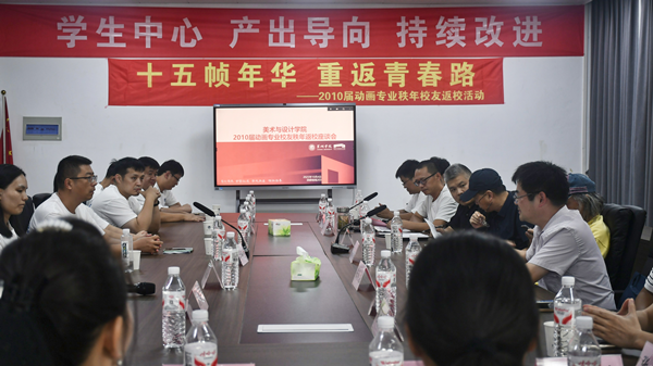 10月4日,美术与设计学院2010(首)届动画专业部分校友重返母校,举行以“十五帧年华 重返青春路”为主题的返校活动。二十余位校友从五湖四海如约而归,在美术与设计学院会议室开展座谈交流。原艺术系党总支书记刘洪涛、主任胡是平,校友办主任陈和龙、美术与设计学院院长李超峰、副院长田世彬、辅导员刘靖宇以及动画专业教师参加“线上+线下”座谈会,会议由田世彬主持。