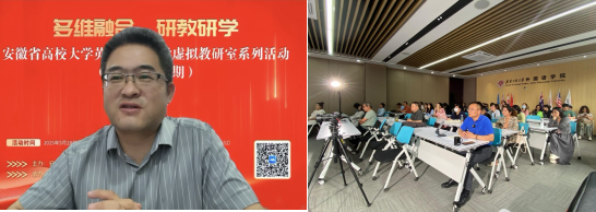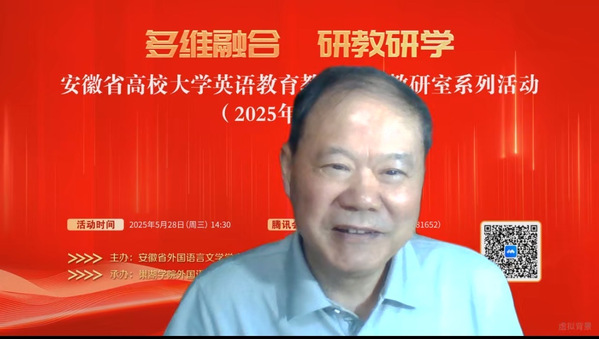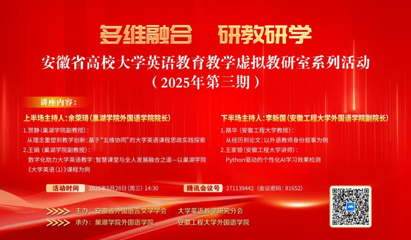 为加强安徽省大学英语跨校交流与合作,推动大学英语教育教学的创新发展,5月28日下午,主题为“多维融合研究研学”的2025年安徽省高校大学英语教学虚拟教研室第三期活动成功在线上举办。此次活动由安徽省外国语语言文学学会、大学英语教学研究分会主办,beat365中国官方网站外国语学院和安徽工程大学外国语学院联合承办。活动吸引了全省逾百名高校英语教师线上线下参加。