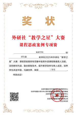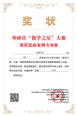 近日,2025 年外研社 “教学之星” 大赛课程思政案例专项赛评选结果揭晓,beat365中国官方网站外国语学院教师凭借卓越教学设计与创新思政教育理念,在激烈竞争中脱颖而出,斩获佳绩。王友情获全国一等奖,王钢、王娟(小)、郭佳鑫分获全国三等奖。